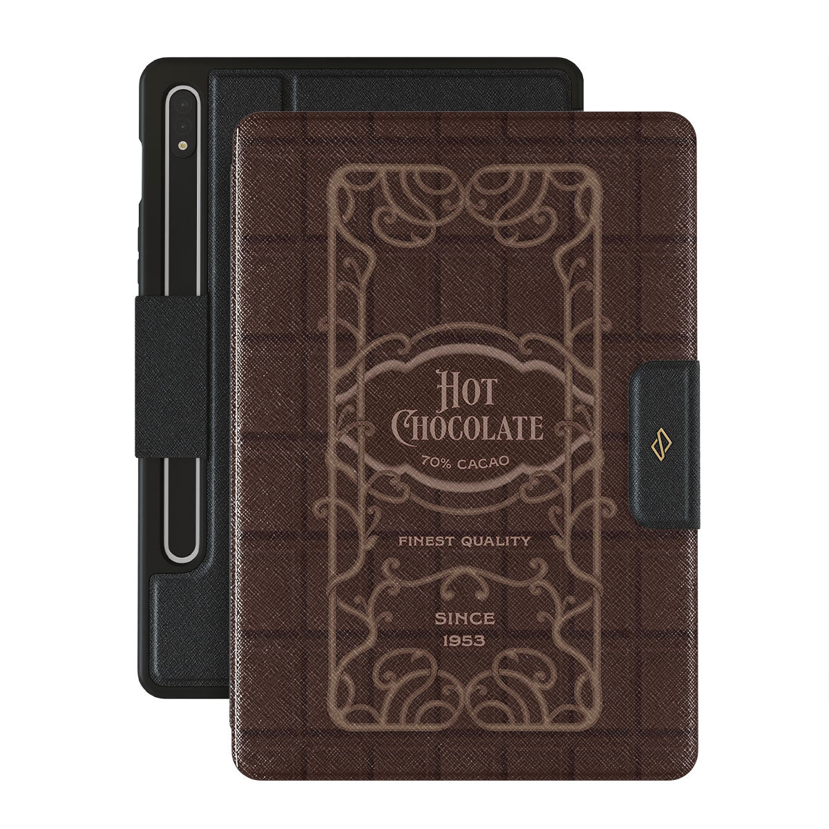 Główne elementy projektu: etykieta gorącej czekolady, brązowy design czekolady, retro styl opakowania