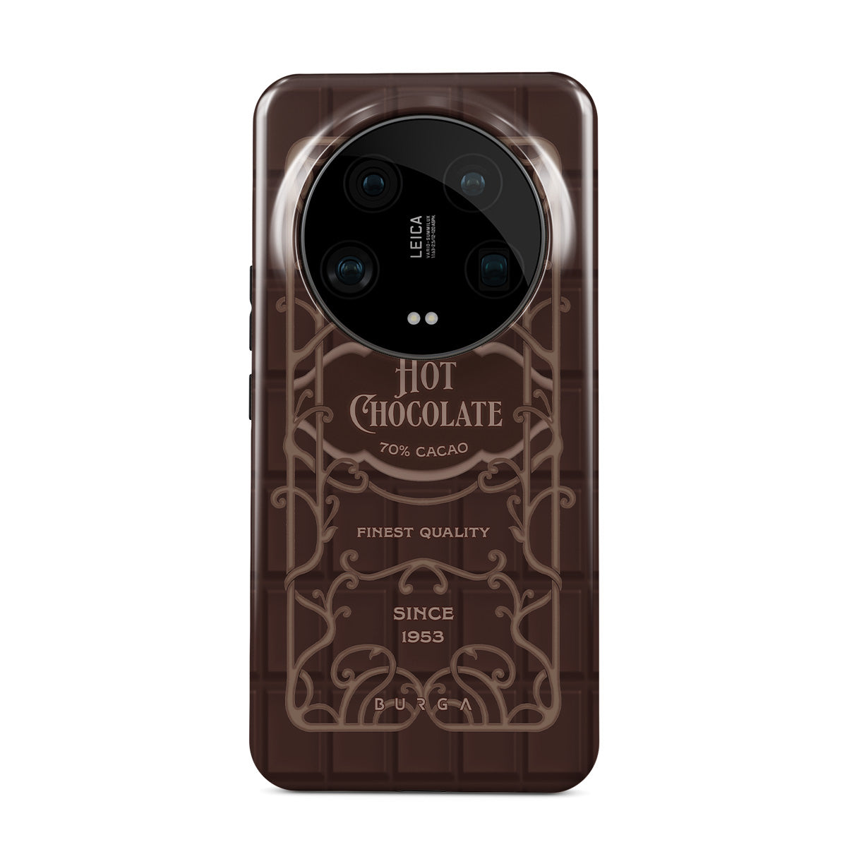 Główne elementy projektu: etykieta gorącej czekolady, brązowy design czekolady, retro styl opakowania