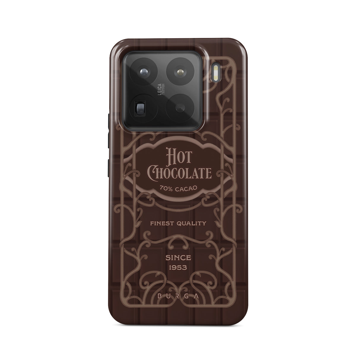 Główne elementy projektu: etykieta gorącej czekolady, brązowy design czekolady, retro styl opakowania