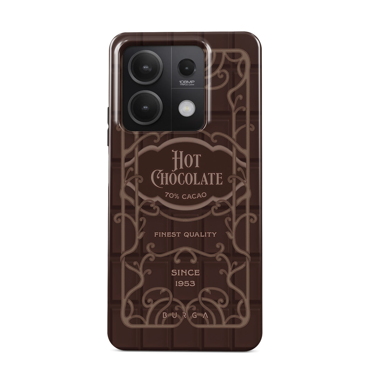 Główne elementy projektu: etykieta gorącej czekolady, brązowy design czekolady, retro styl opakowania