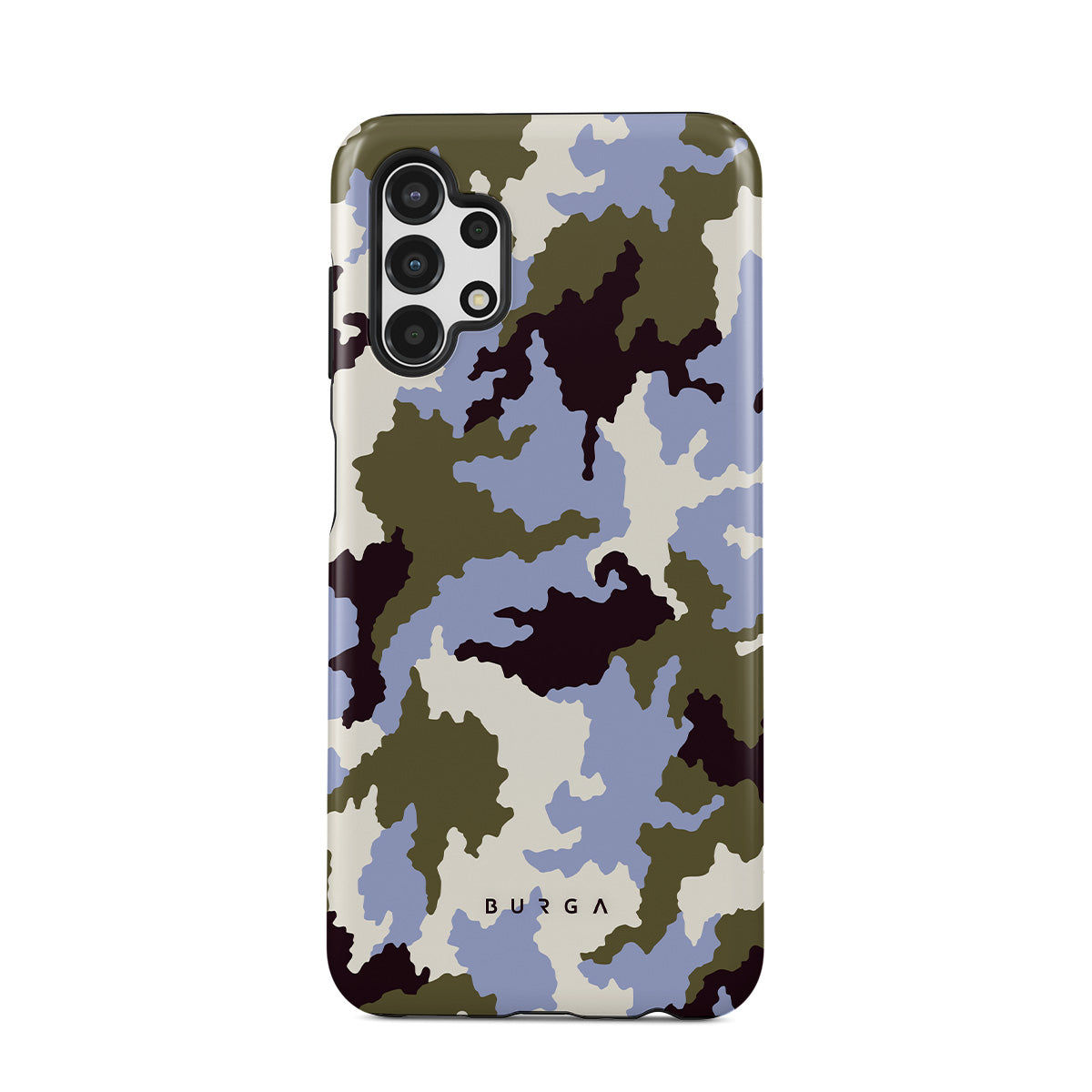 Główne elementy projektu: motyw maskujący, kolor zielony, kolor niebieski, motyw wojskowy, abstrakcyjne kształty