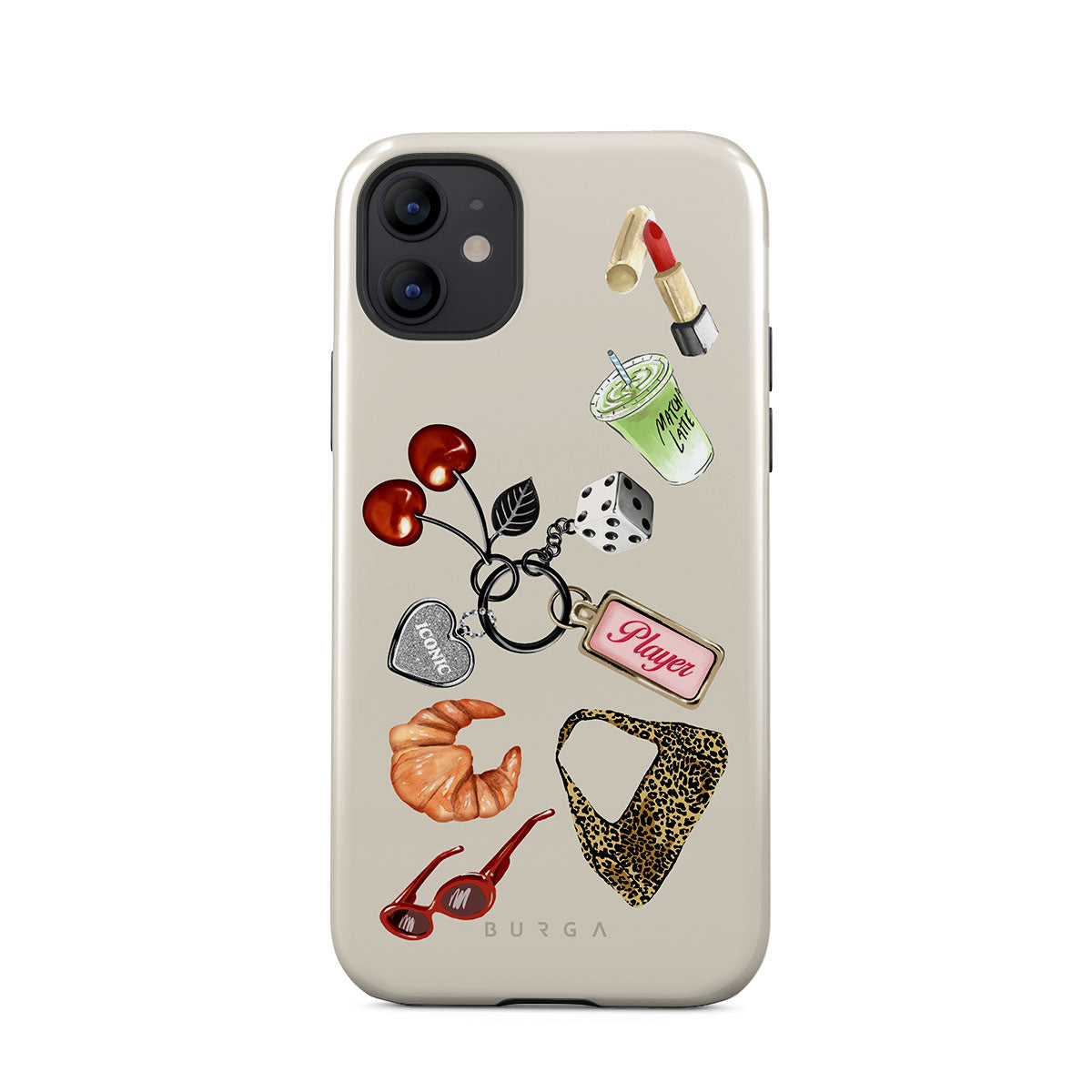 Główne elementy projektu: czerwone okulary przeciwsłoneczne, czerwoną szminkę, zieloną matchę, croissanta, czarne kostki do gry, torebkę w panterkę, brelok z srebrnym sercem, wiśnie, kostki do gry i zawieszkę „Player”.