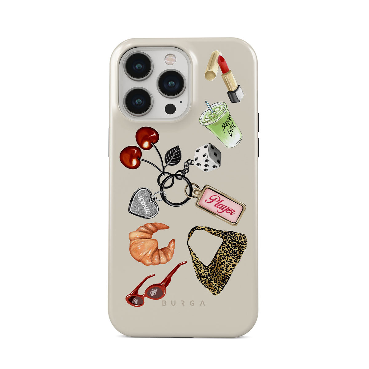 Główne elementy projektu: czerwone okulary przeciwsłoneczne, czerwoną szminkę, zieloną matchę, croissanta, czarne kostki do gry, torebkę w panterkę, brelok z srebrnym sercem, wiśnie, kostki do gry i zawieszkę „Player”.