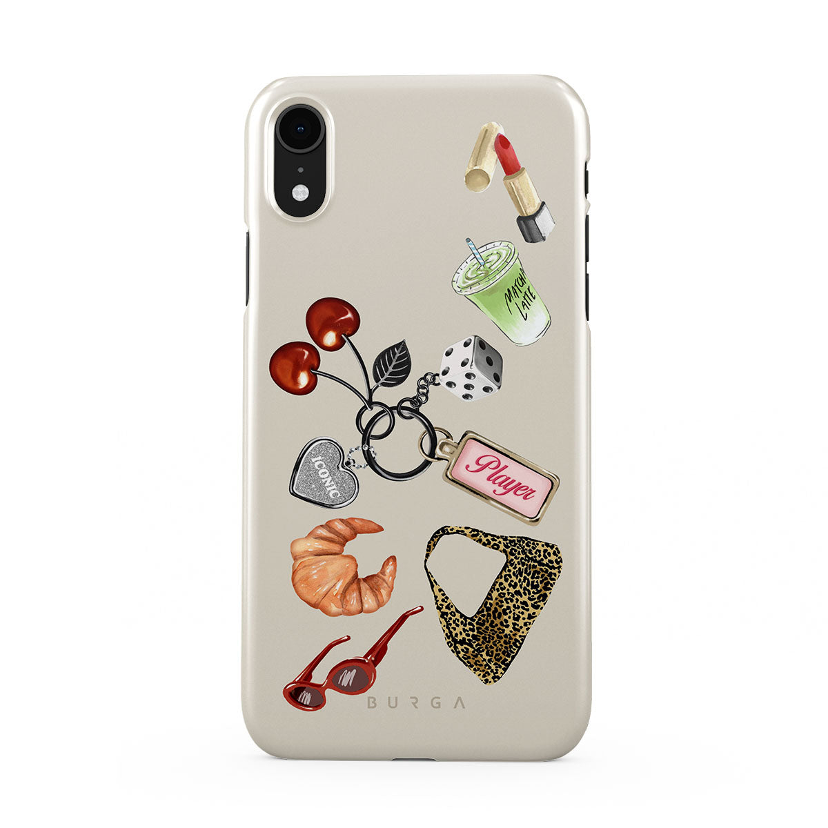 Główne elementy projektu: czerwone okulary przeciwsłoneczne, czerwoną szminkę, zieloną matchę, croissanta, czarne kostki do gry, torebkę w panterkę, brelok z srebrnym sercem, wiśnie, kostki do gry i zawieszkę „Player”.