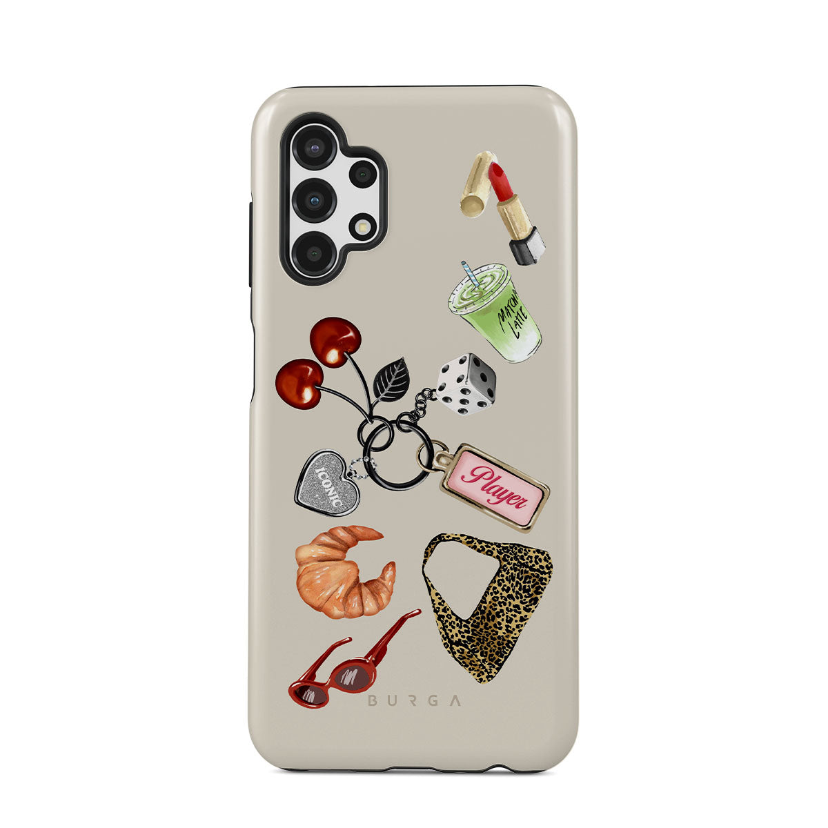 Główne elementy projektu: czerwone okulary przeciwsłoneczne, czerwoną szminkę, zieloną matchę, croissanta, czarne kostki do gry, torebkę w panterkę, brelok z srebrnym sercem, wiśnie, kostki do gry i zawieszkę „Player”.