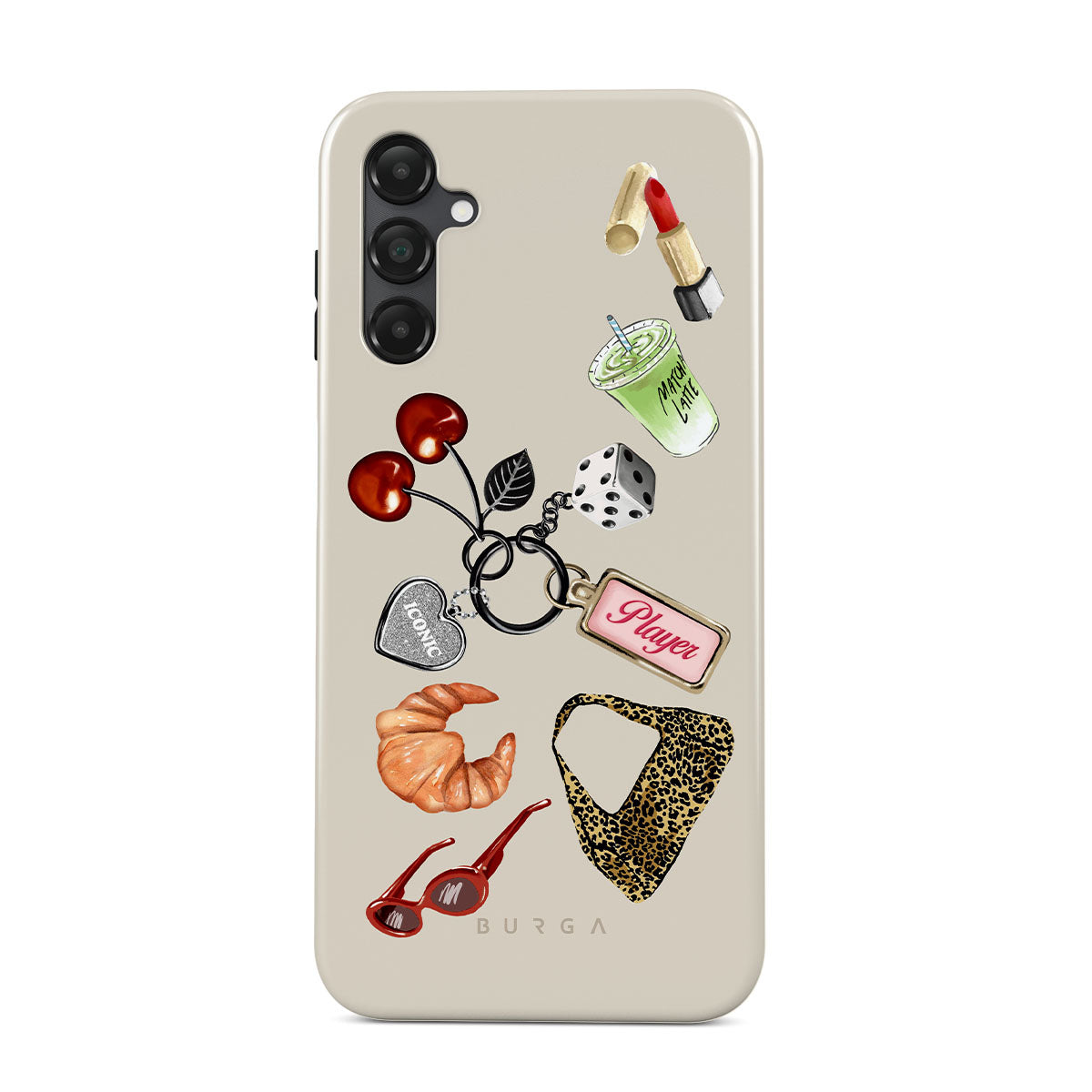 Główne elementy projektu: czerwone okulary przeciwsłoneczne, czerwoną szminkę, zieloną matchę, croissanta, czarne kostki do gry, torebkę w panterkę, brelok z srebrnym sercem, wiśnie, kostki do gry i zawieszkę „Player”.