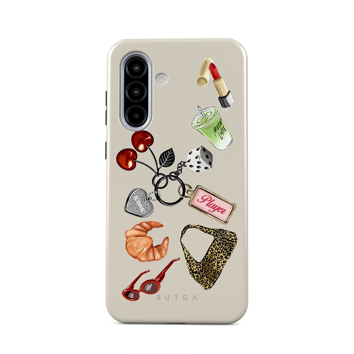 Główne elementy projektu: czerwone okulary przeciwsłoneczne, czerwoną szminkę, zieloną matchę, croissanta, czarne kostki do gry, torebkę w panterkę, brelok z srebrnym sercem, wiśnie, kostki do gry i zawieszkę „Player”.