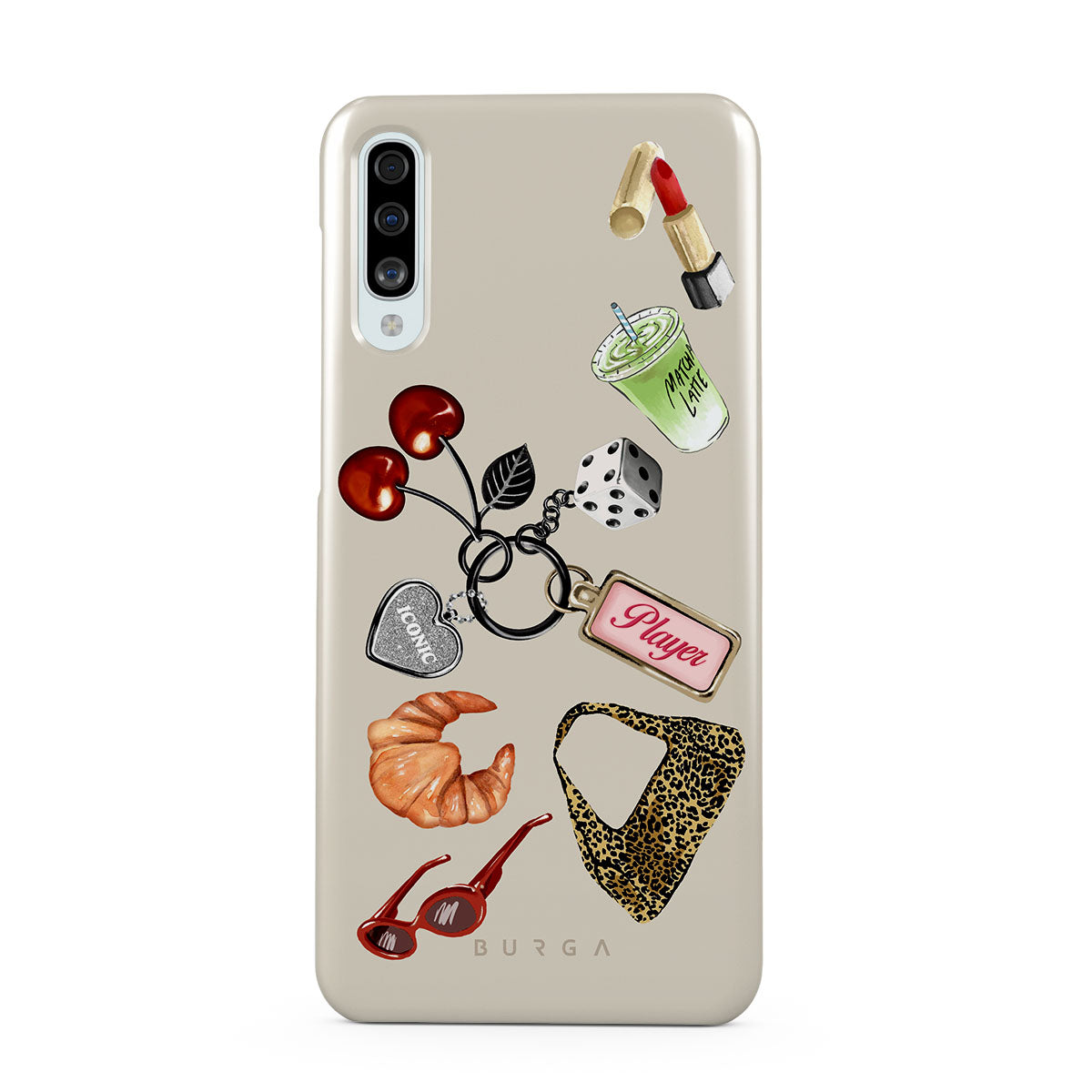 Główne elementy projektu: czerwone okulary przeciwsłoneczne, czerwoną szminkę, zieloną matchę, croissanta, czarne kostki do gry, torebkę w panterkę, brelok z srebrnym sercem, wiśnie, kostki do gry i zawieszkę „Player”.