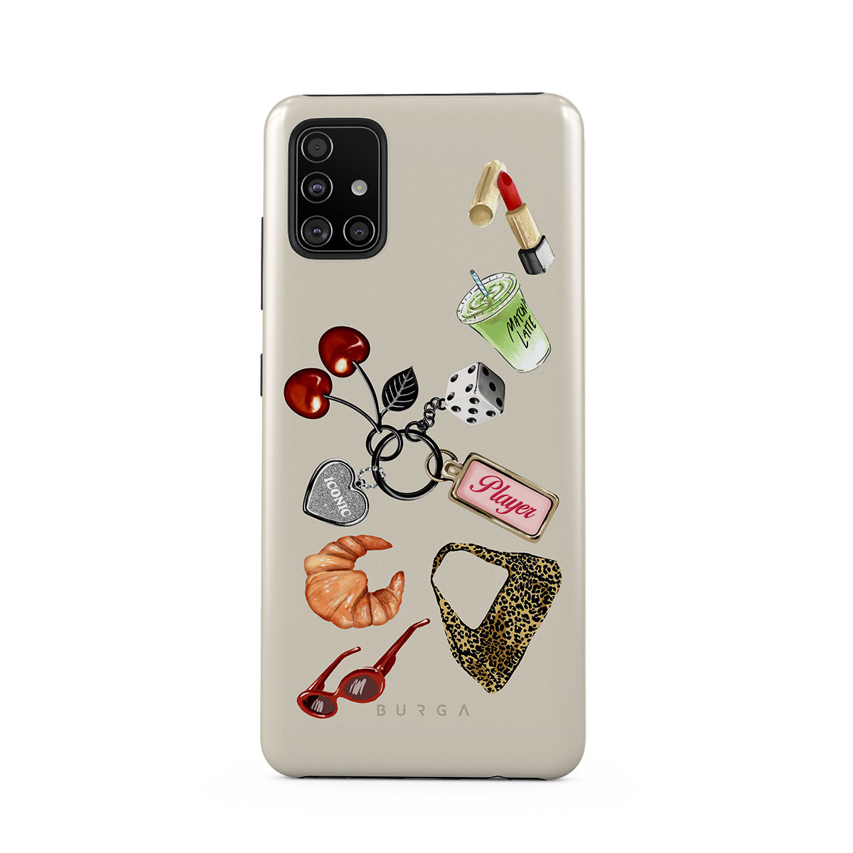 Główne elementy projektu: czerwone okulary przeciwsłoneczne, czerwoną szminkę, zieloną matchę, croissanta, czarne kostki do gry, torebkę w panterkę, brelok z srebrnym sercem, wiśnie, kostki do gry i zawieszkę „Player”.