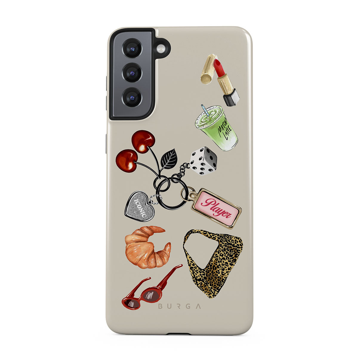 Główne elementy projektu: czerwone okulary przeciwsłoneczne, czerwoną szminkę, zieloną matchę, croissanta, czarne kostki do gry, torebkę w panterkę, brelok z srebrnym sercem, wiśnie, kostki do gry i zawieszkę „Player”.