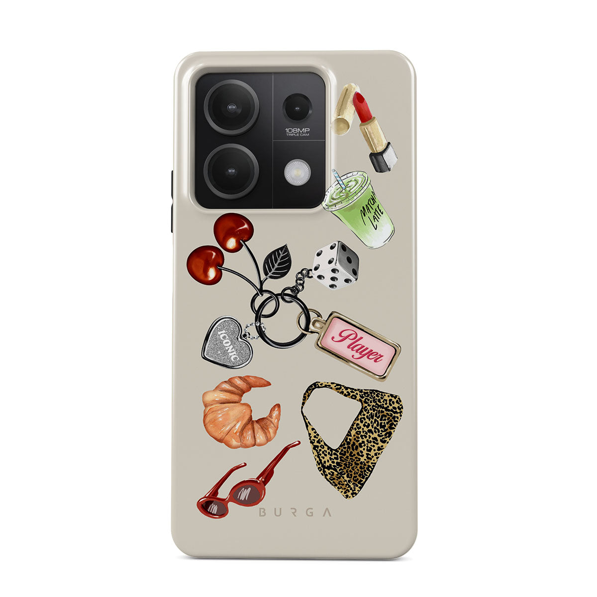 Główne elementy projektu: czerwone okulary przeciwsłoneczne, czerwoną szminkę, zieloną matchę, croissanta, czarne kostki do gry, torebkę w panterkę, brelok z srebrnym sercem, wiśnie, kostki do gry i zawieszkę „Player”.