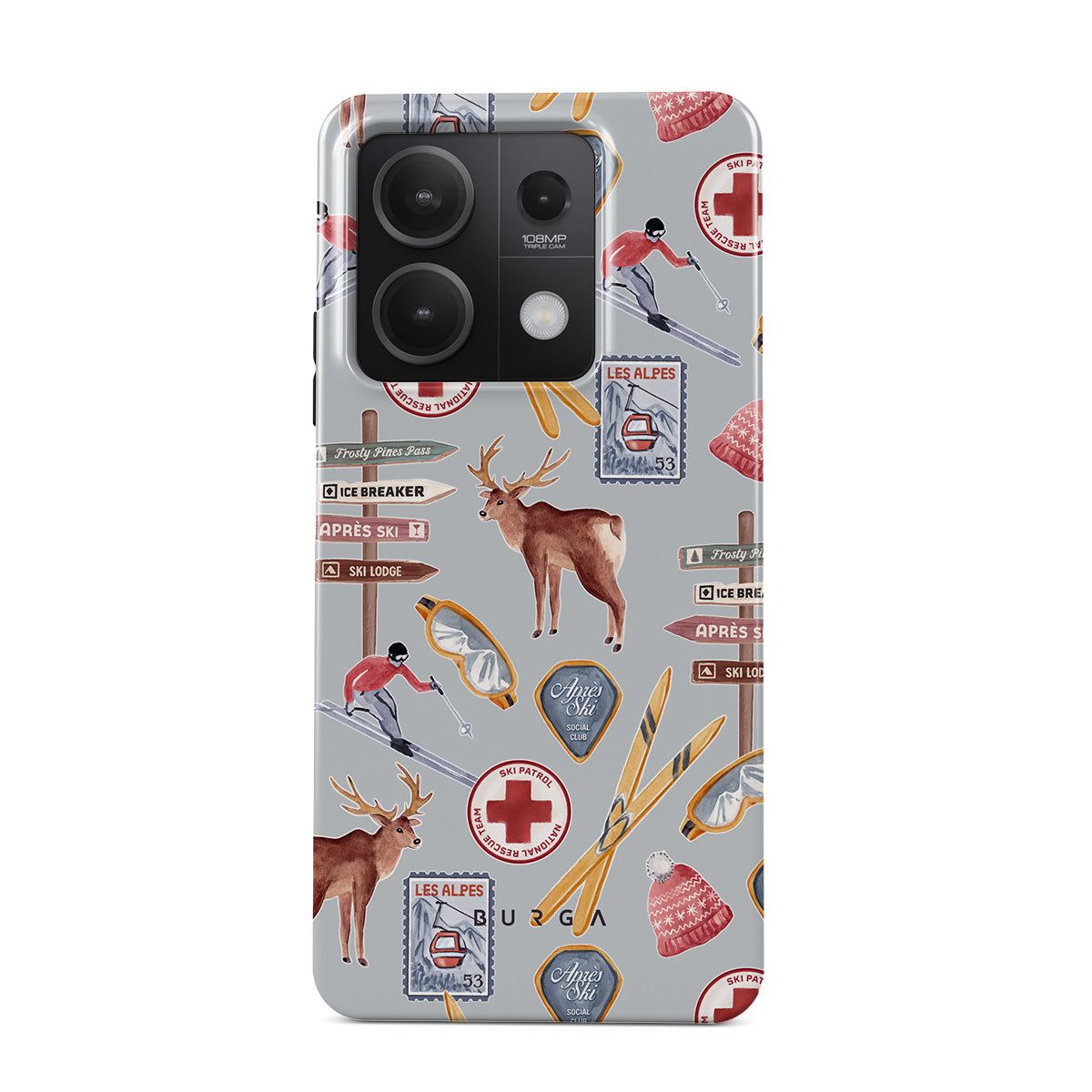 Główne elementy projektu: plakat vintage narciarski, retro ośrodek narciarski, ilustracja jelenia, design wyciągu narciarskiego, alpejski wzór, sporty zimowe, klasyczny styl chatki narciarskiej, grafiki ośrodka górskiego