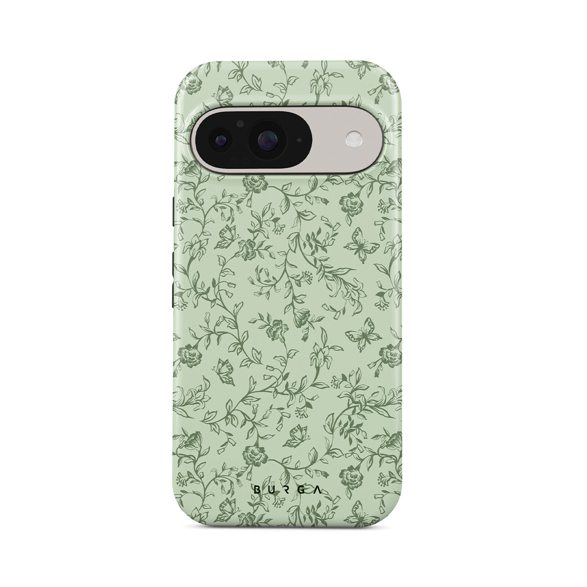 Główne elementy projektu: zielony wzór kwiatowy, kwiaty, motyle