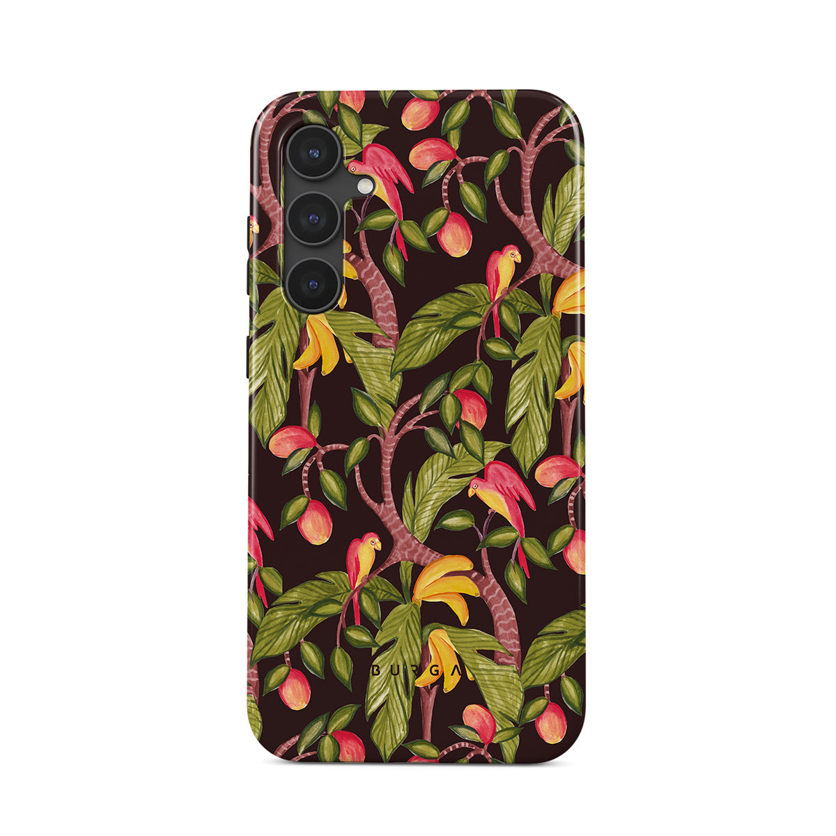 Główne elementy projektu: mango, ciemnozielone liście, wzór inspirowany dżunglą