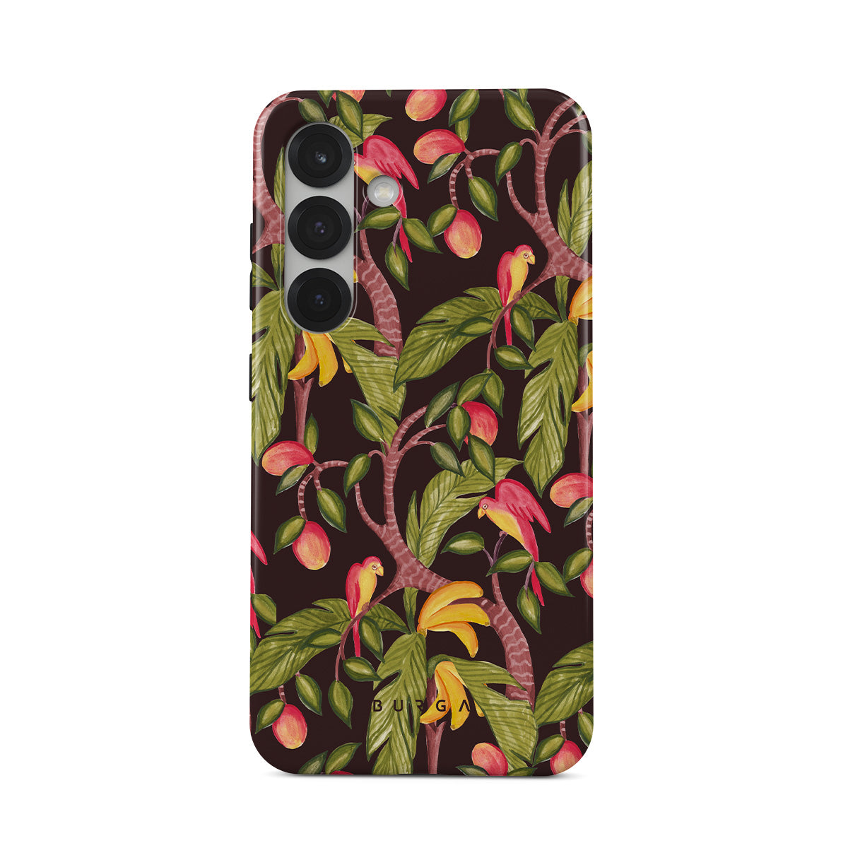Główne elementy projektu: mango, ciemnozielone liście, wzór inspirowany dżunglą