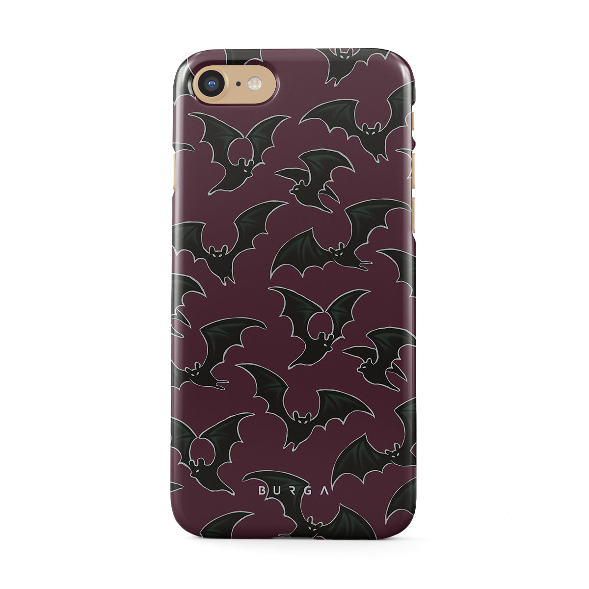 Główne elementy projektu: motyw Halloween, nietoperze, bordowe tło