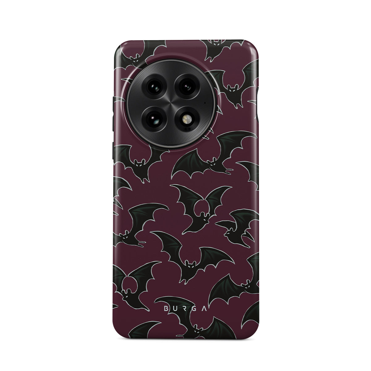 Główne elementy projektu: motyw Halloween, nietoperze, bordowe tło