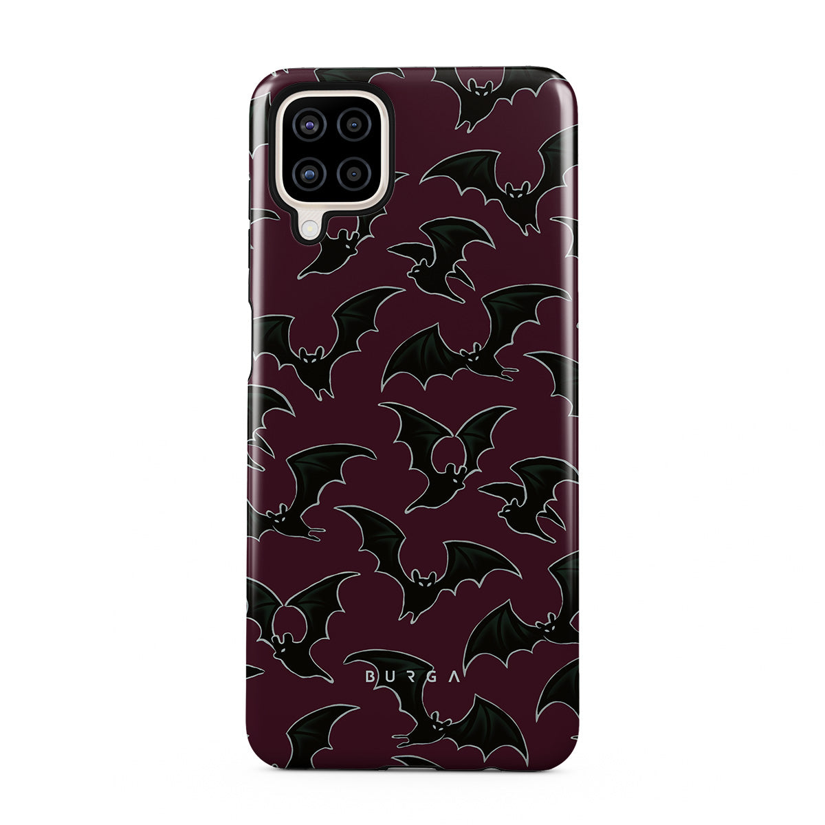 Główne elementy projektu: motyw Halloween, nietoperze, bordowe tło