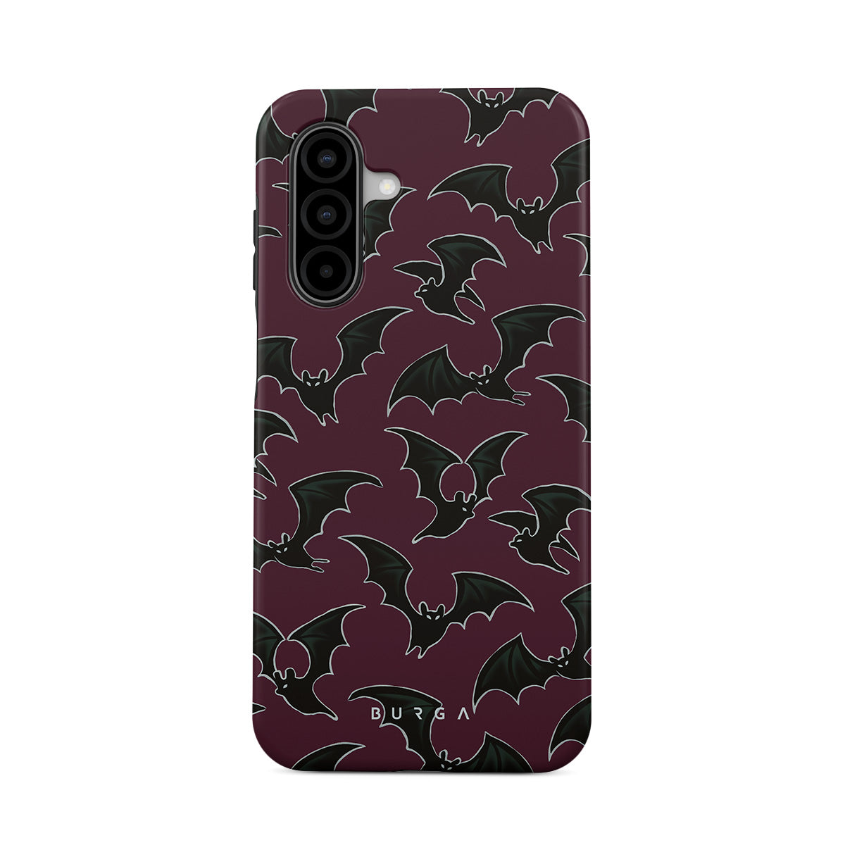 Główne elementy projektu: motyw Halloween, nietoperze, bordowe tło