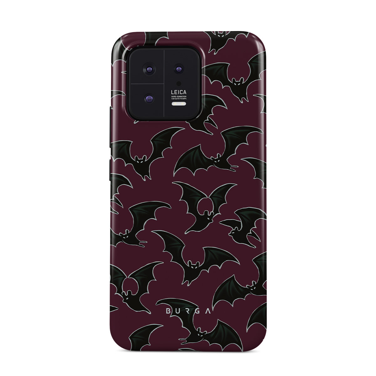 Główne elementy projektu: motyw Halloween, nietoperze, bordowe tło