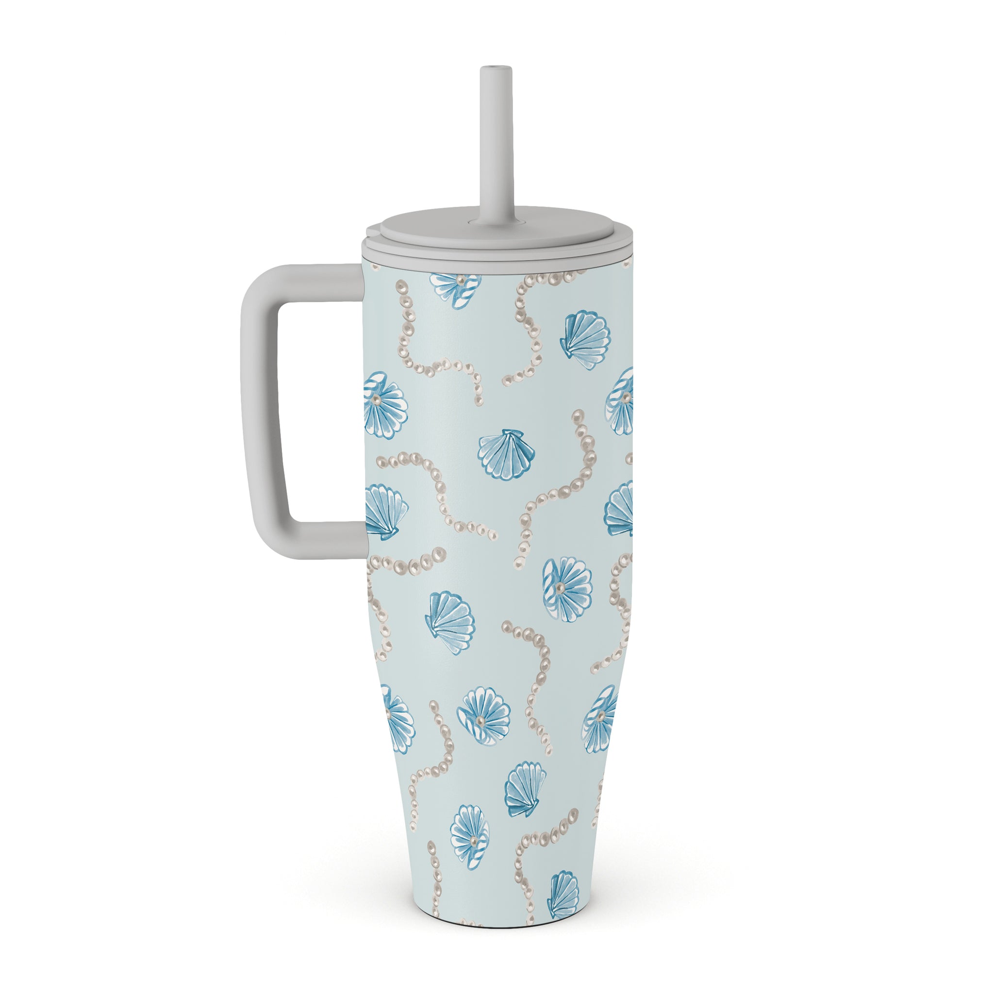 Główne elementy projektu: perły, muszle, jasnoniebieskie tło, elementy oceaniczne.
