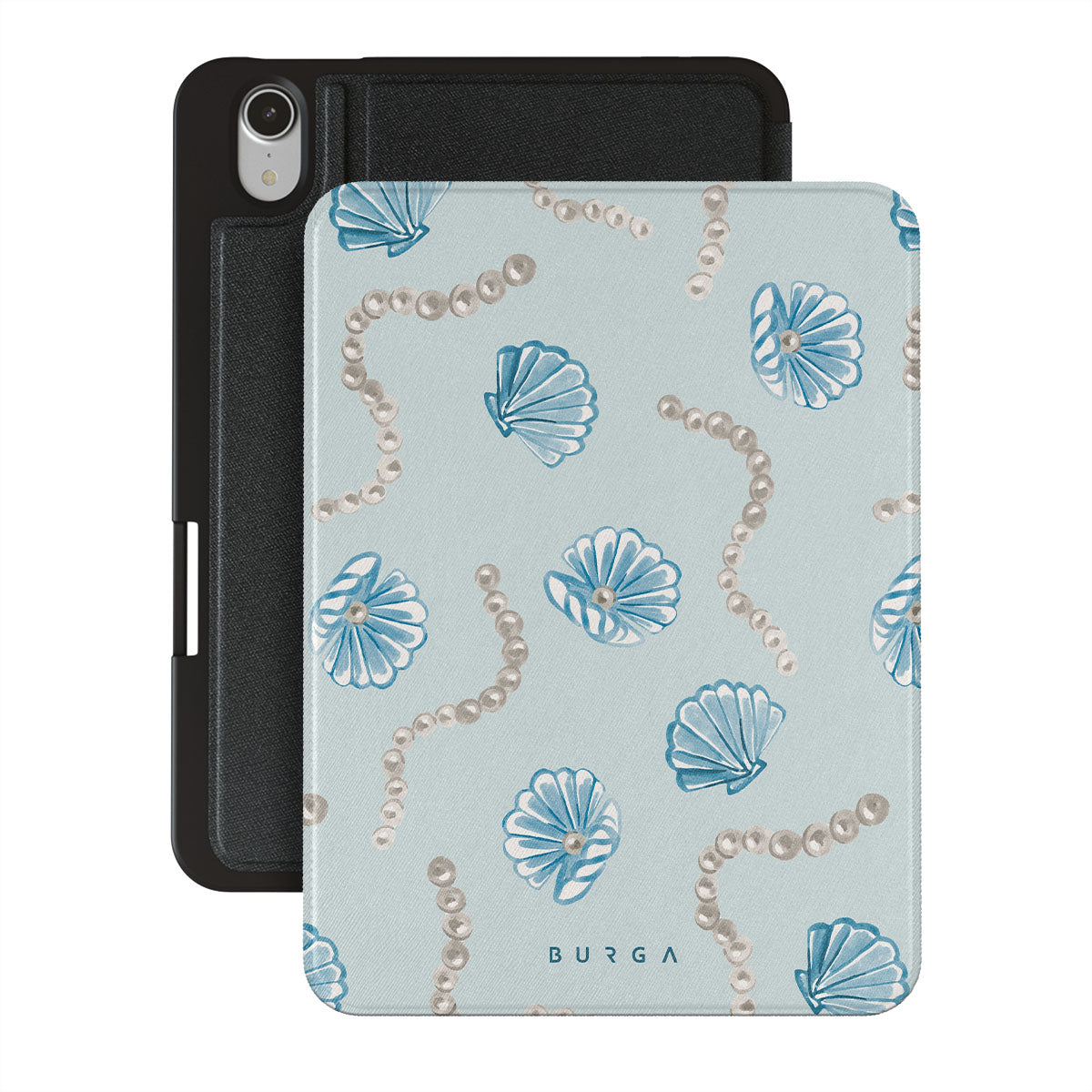 Główne elementy projektu: perły, muszle, jasnoniebieskie tło, elementy oceaniczne.