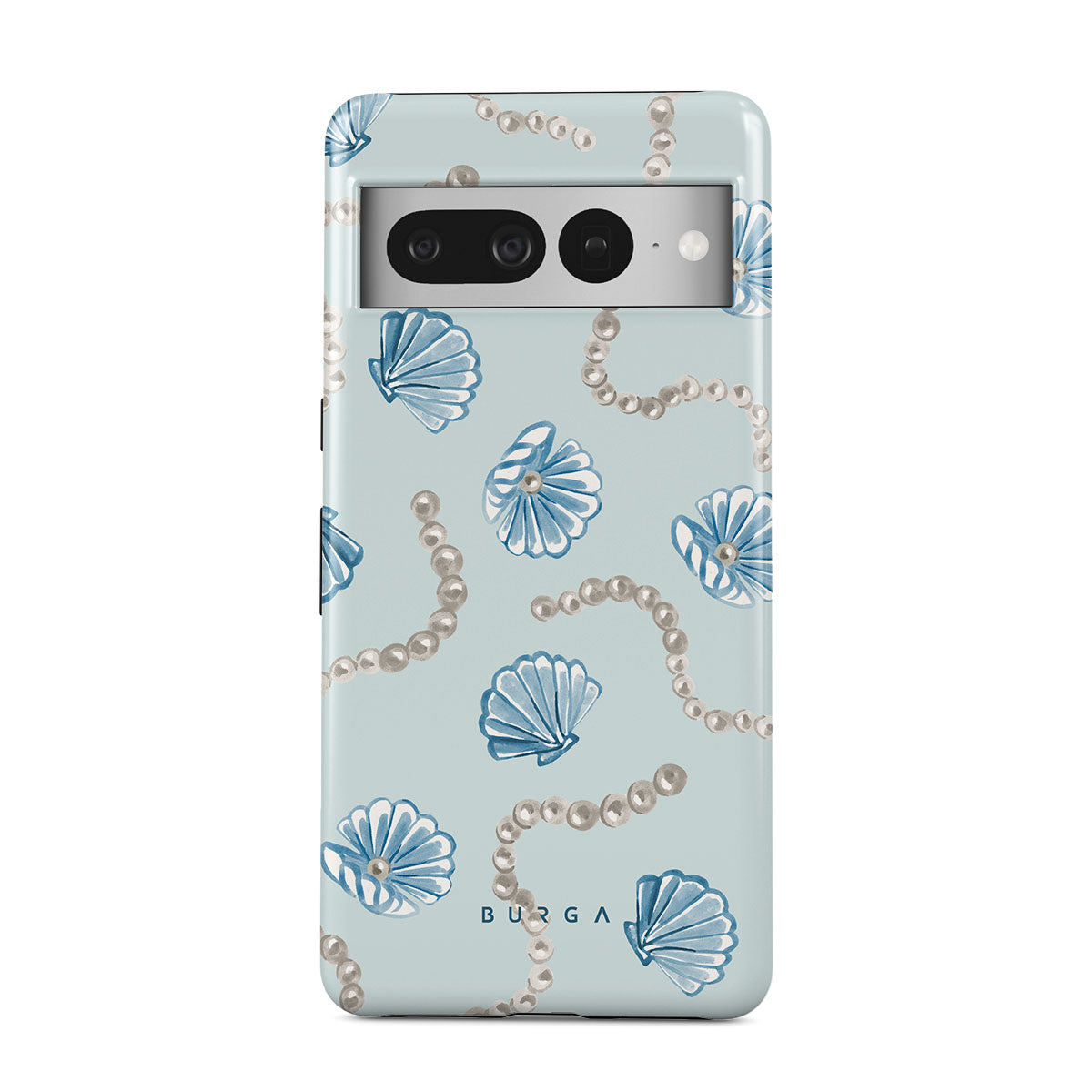 Główne elementy projektu: perły, muszle, jasnoniebieskie tło, elementy oceaniczne.
