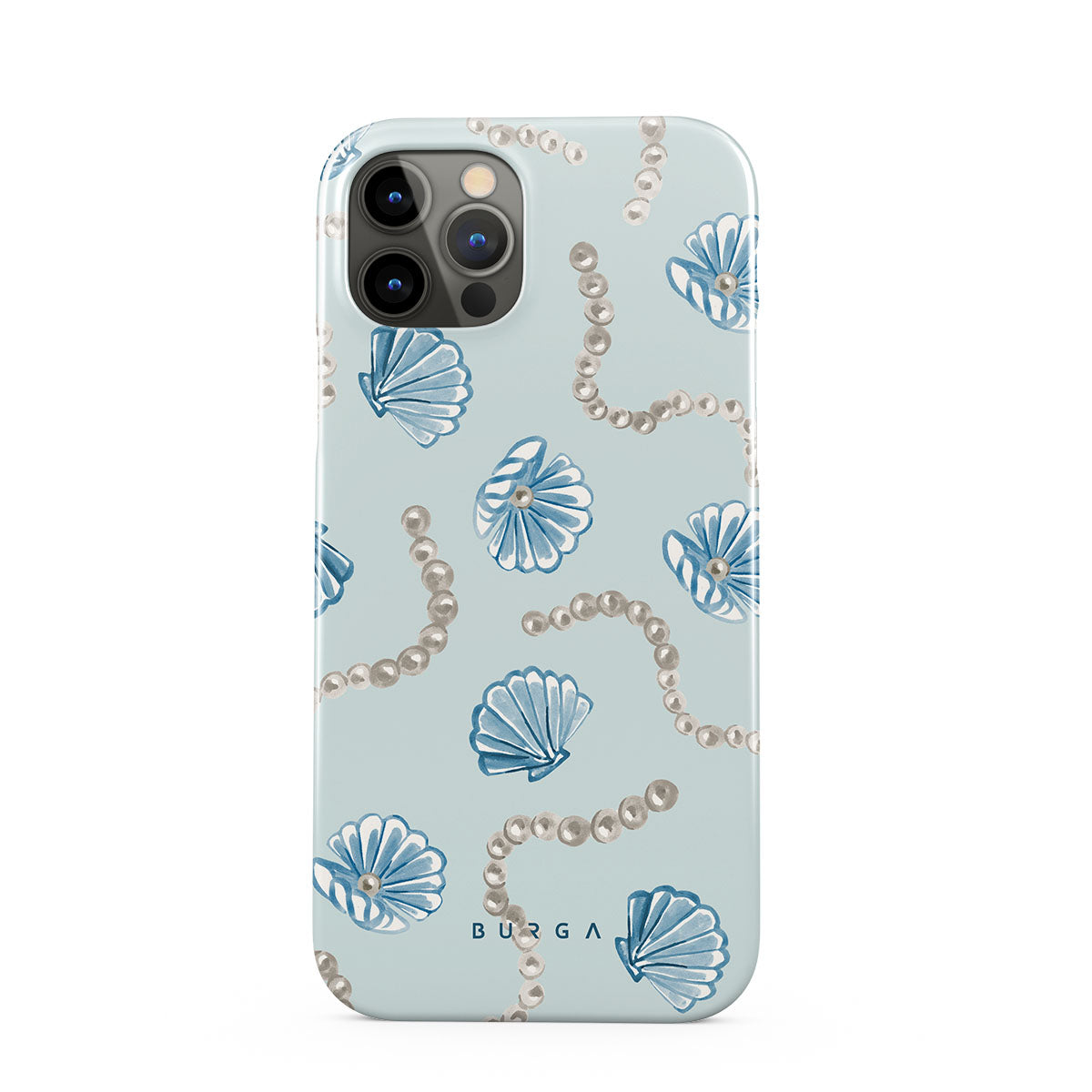 Główne elementy projektu: perły, muszle, jasnoniebieskie tło, elementy oceaniczne.