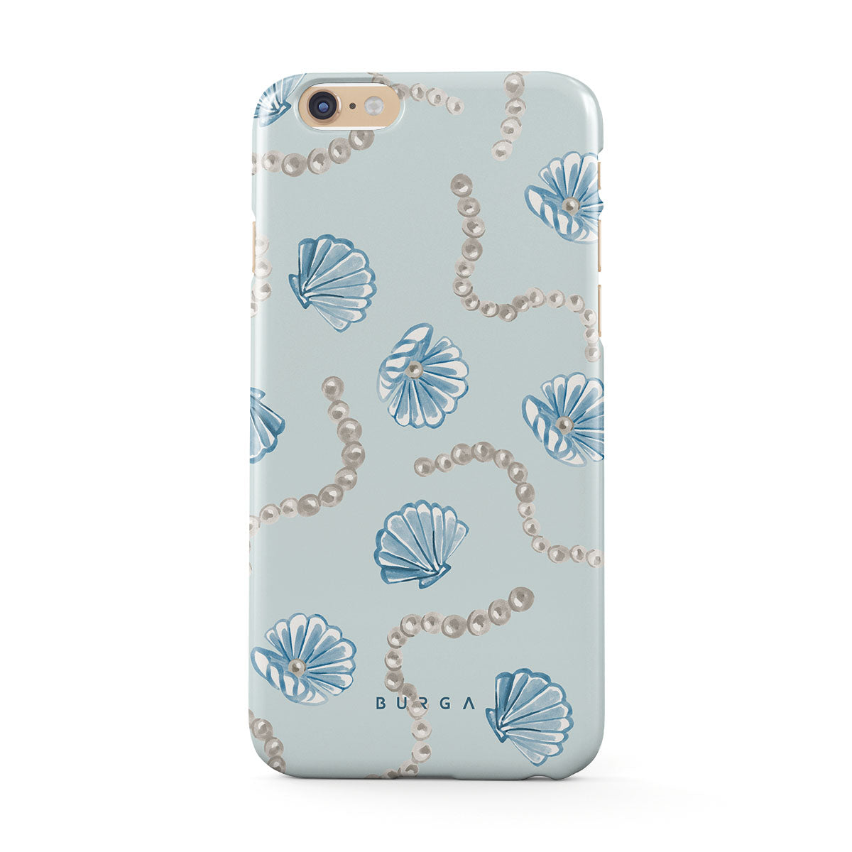 Główne elementy projektu: perły, muszle, jasnoniebieskie tło, elementy oceaniczne.