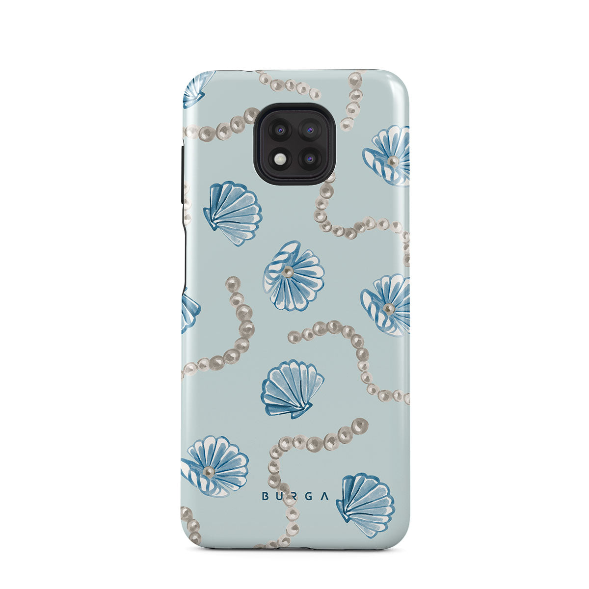 Główne elementy projektu: perły, muszle, jasnoniebieskie tło, elementy oceaniczne.