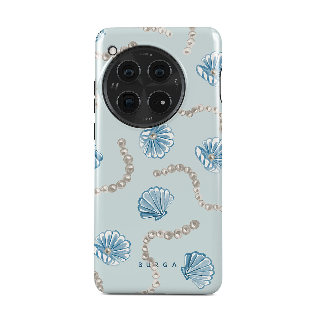 Główne elementy projektu: perły, muszle, jasnoniebieskie tło, elementy oceaniczne.