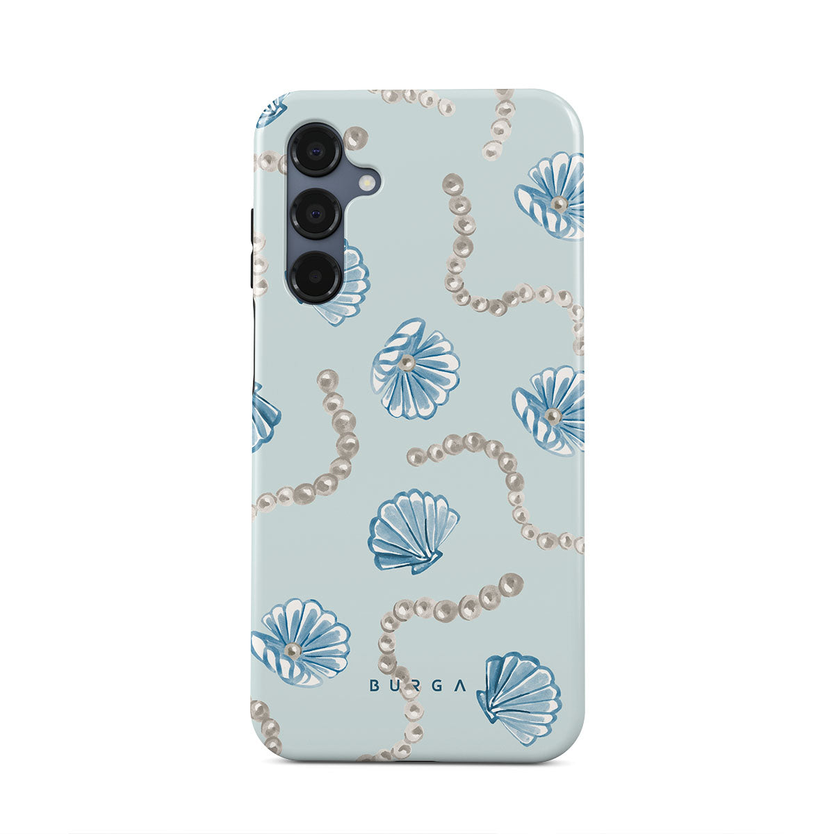 Główne elementy projektu: perły, muszle, jasnoniebieskie tło, elementy oceaniczne.