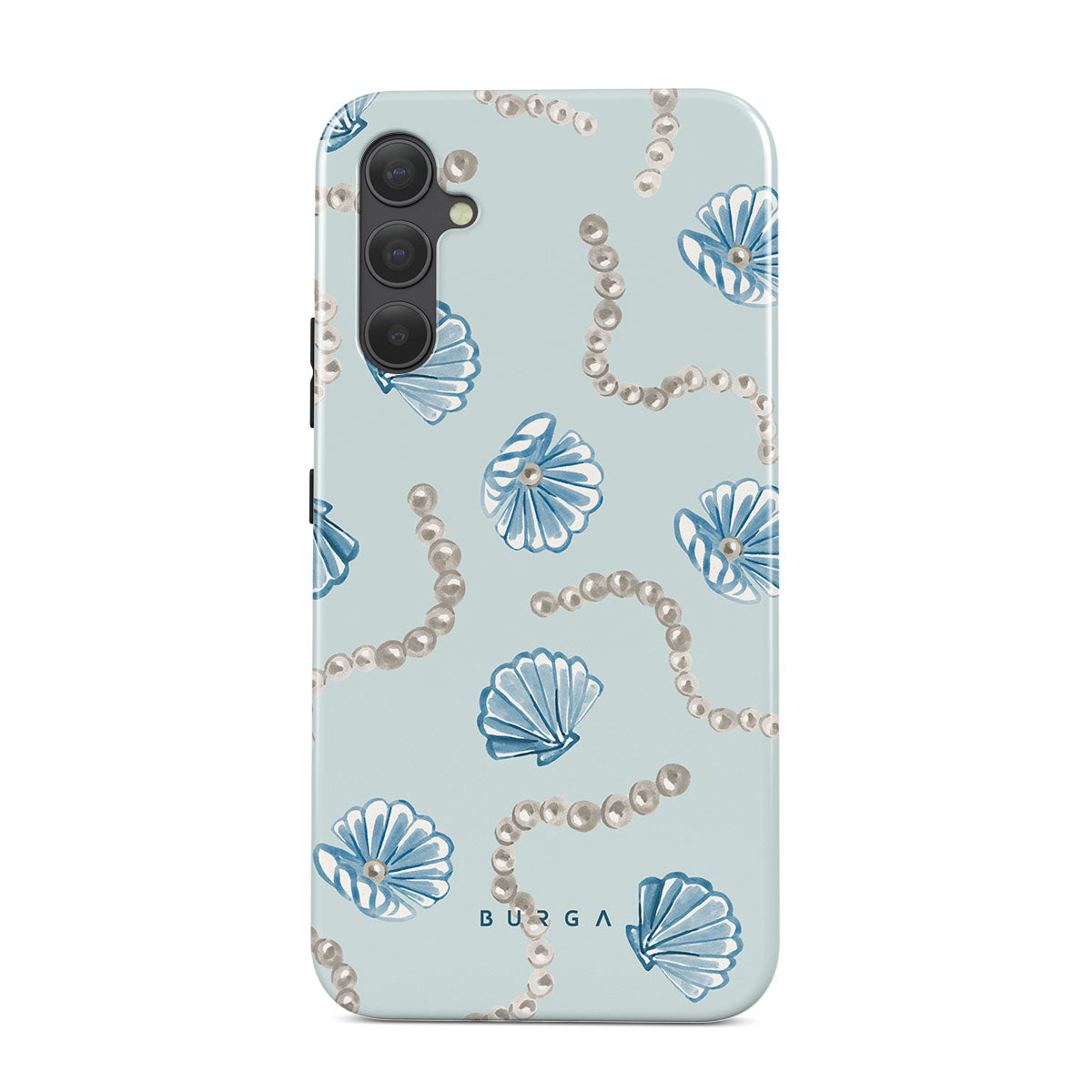 Główne elementy projektu: perły, muszle, jasnoniebieskie tło, elementy oceaniczne.