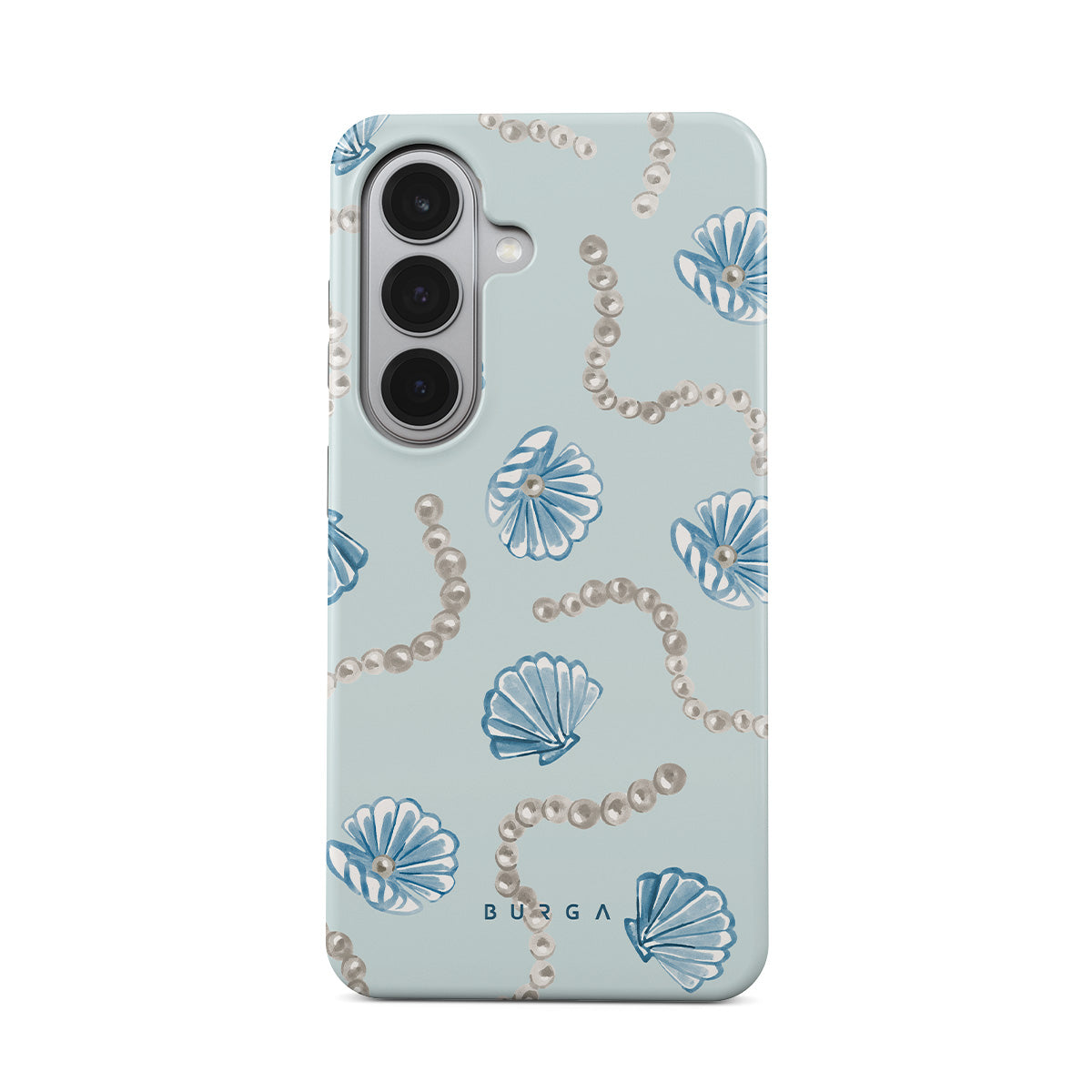 Główne elementy projektu: perły, muszle, jasnoniebieskie tło, elementy oceaniczne.