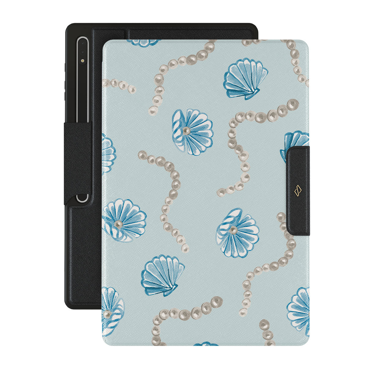 Główne elementy projektu: perły, muszle, jasnoniebieskie tło, elementy oceaniczne.