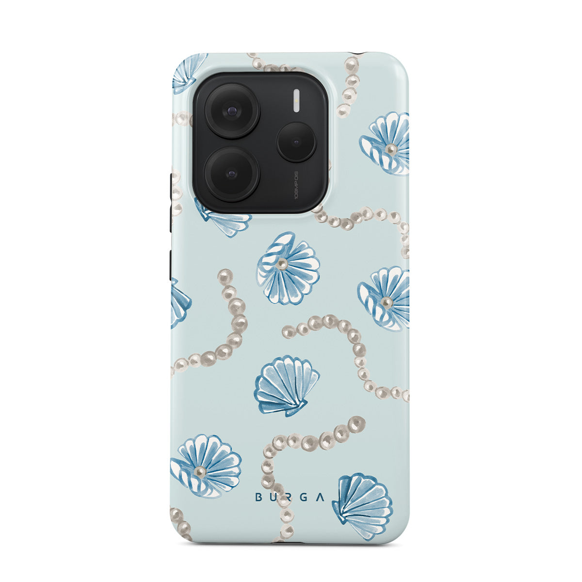Główne elementy projektu: perły, muszle, jasnoniebieskie tło, elementy oceaniczne.