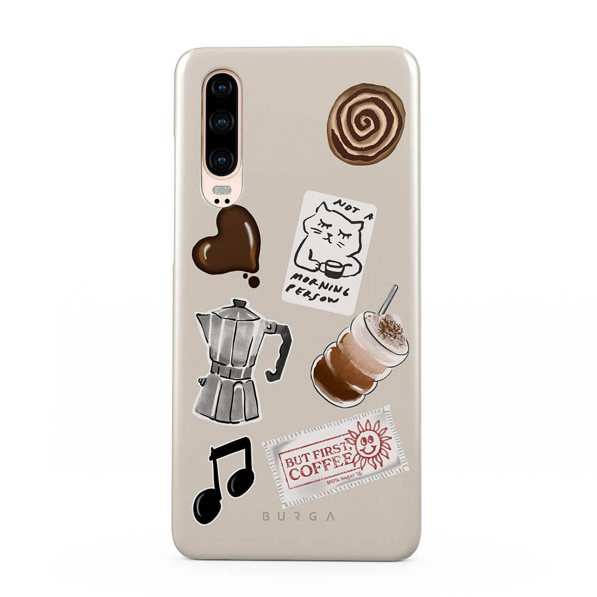 Główne elementy projektu: kawiarkę moka, frappé, cynamonową bułeczkę, czekoladowe serce, naklejkę „Not a morning person”, paragon „But First, Coffee”, nutkę muzyczną.