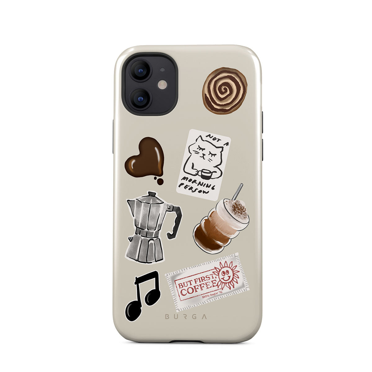 Główne elementy projektu: kawiarkę moka, frappé, cynamonową bułeczkę, czekoladowe serce, naklejkę „Not a morning person”, paragon „But First, Coffee”, nutkę muzyczną.
