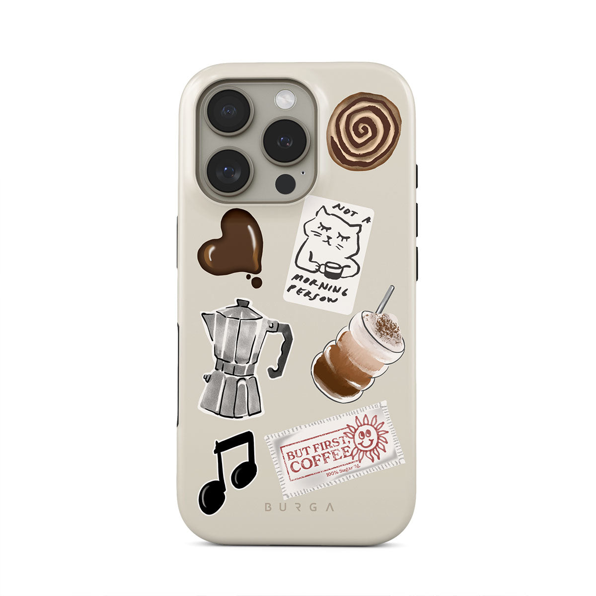 Główne elementy projektu: kawiarkę moka, frappé, cynamonową bułeczkę, czekoladowe serce, naklejkę „Not a morning person”, paragon „But First, Coffee”, nutkę muzyczną.