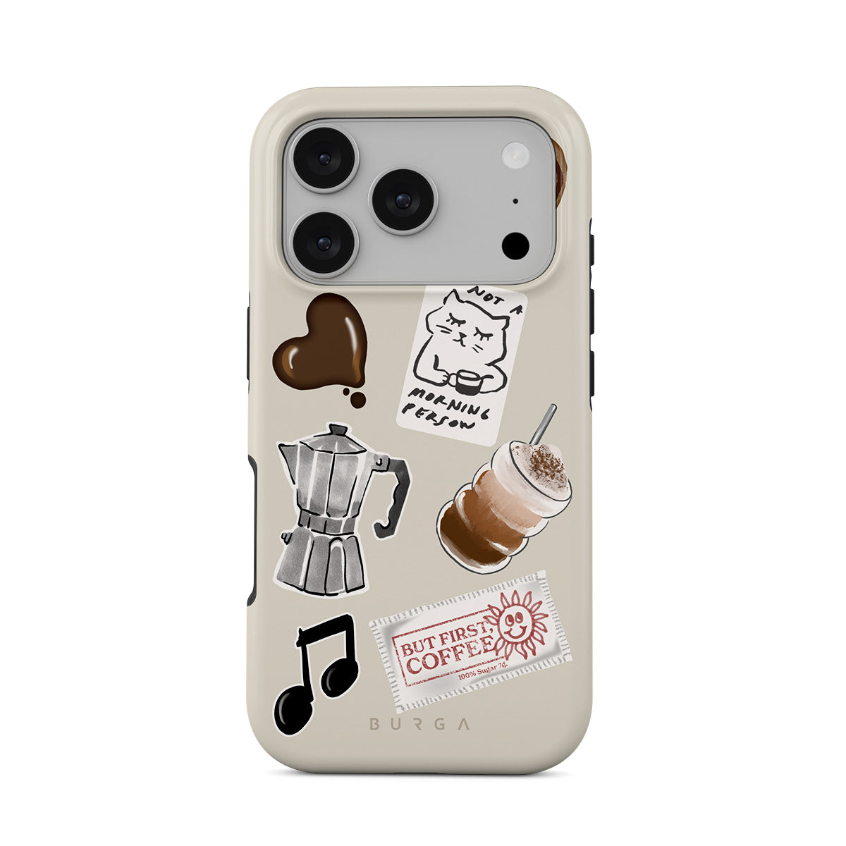 Główne elementy projektu: kawiarkę moka, frappé, cynamonową bułeczkę, czekoladowe serce, naklejkę „Not a morning person”, paragon „But First, Coffee”, nutkę muzyczną.