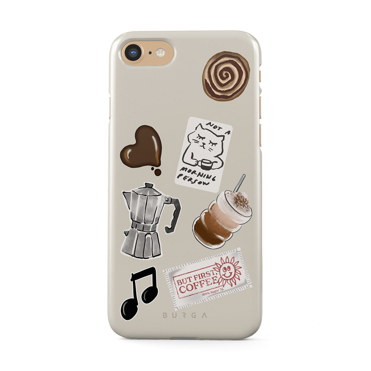Główne elementy projektu: kawiarkę moka, frappé, cynamonową bułeczkę, czekoladowe serce, naklejkę „Not a morning person”, paragon „But First, Coffee”, nutkę muzyczną.