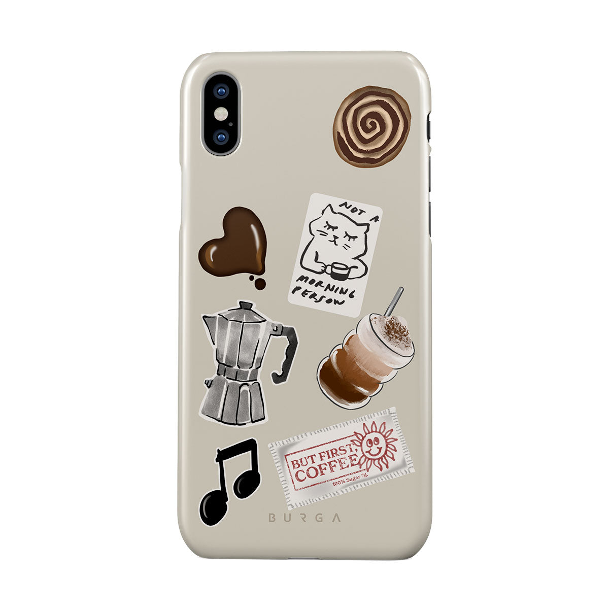 Główne elementy projektu: kawiarkę moka, frappé, cynamonową bułeczkę, czekoladowe serce, naklejkę „Not a morning person”, paragon „But First, Coffee”, nutkę muzyczną.