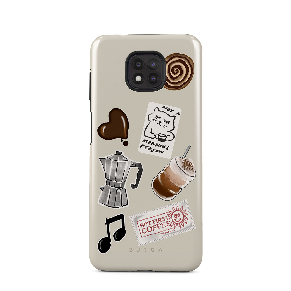 Główne elementy projektu: kawiarkę moka, frappé, cynamonową bułeczkę, czekoladowe serce, naklejkę „Not a morning person”, paragon „But First, Coffee”, nutkę muzyczną.