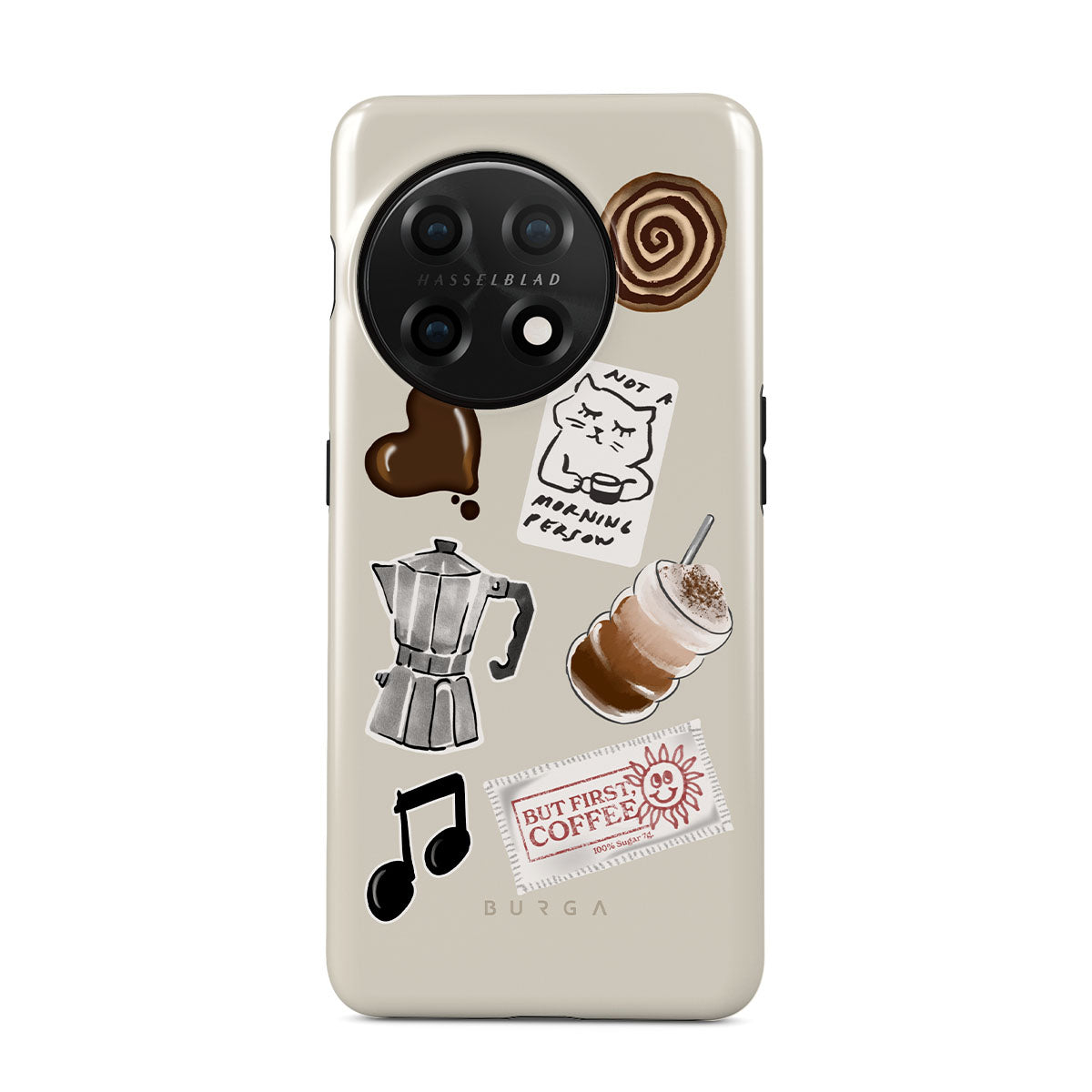 Główne elementy projektu: kawiarkę moka, frappé, cynamonową bułeczkę, czekoladowe serce, naklejkę „Not a morning person”, paragon „But First, Coffee”, nutkę muzyczną.
