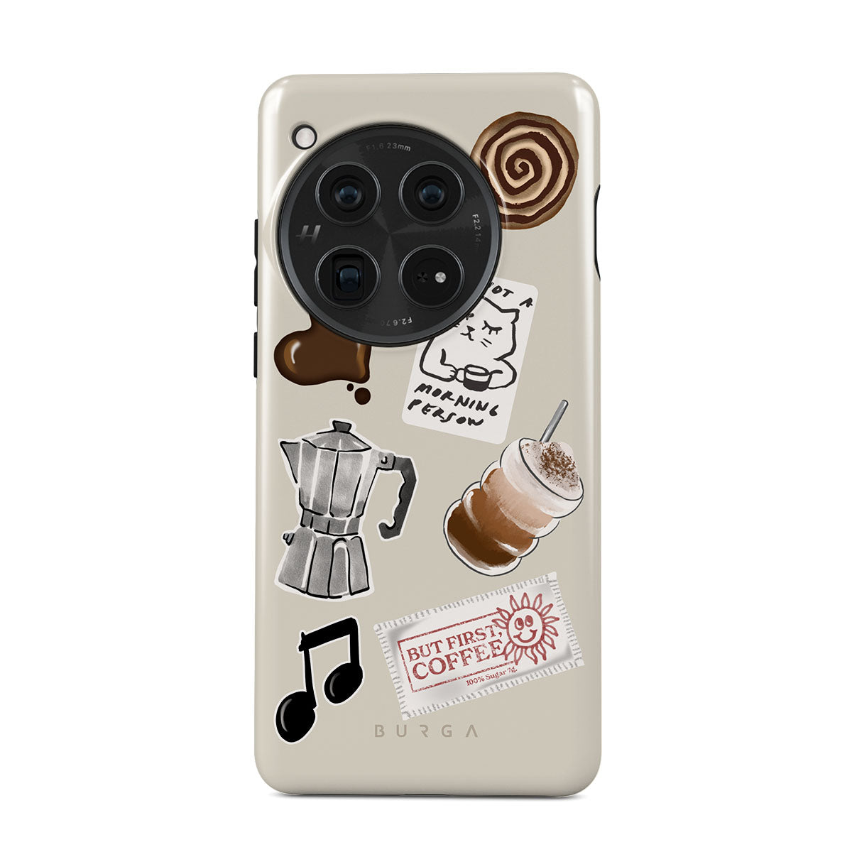 Główne elementy projektu: kawiarkę moka, frappé, cynamonową bułeczkę, czekoladowe serce, naklejkę „Not a morning person”, paragon „But First, Coffee”, nutkę muzyczną.