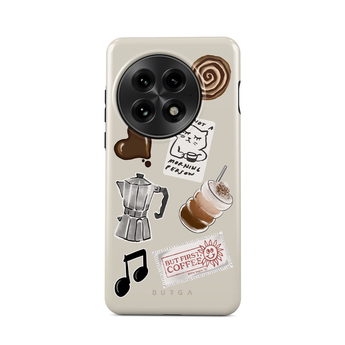 Główne elementy projektu: kawiarkę moka, frappé, cynamonową bułeczkę, czekoladowe serce, naklejkę „Not a morning person”, paragon „But First, Coffee”, nutkę muzyczną.
