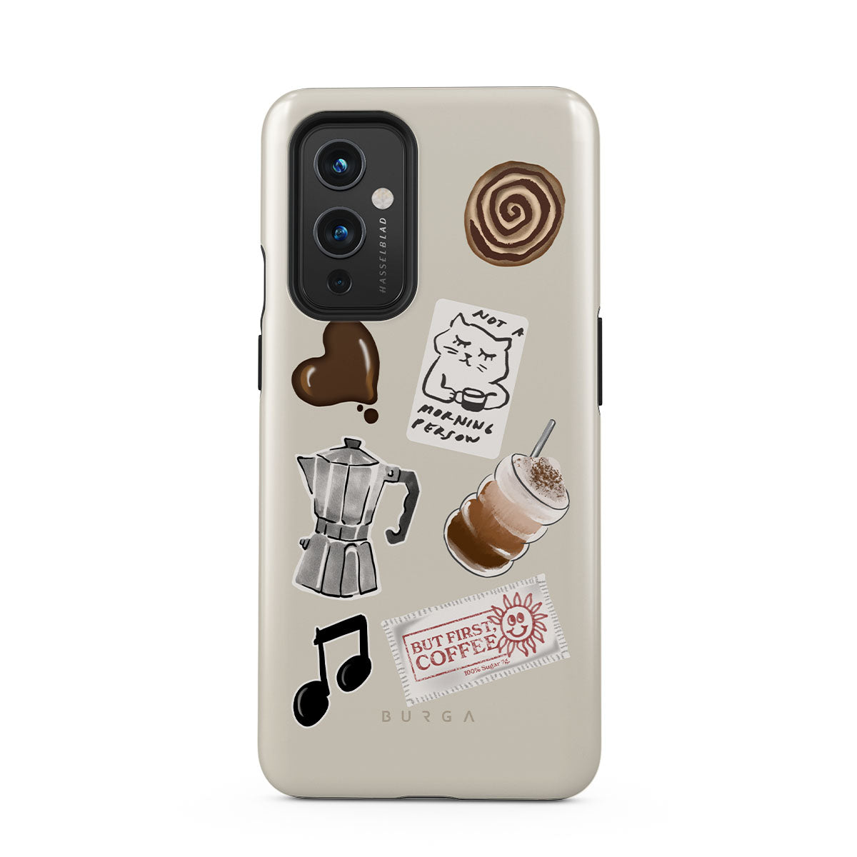Główne elementy projektu: kawiarkę moka, frappé, cynamonową bułeczkę, czekoladowe serce, naklejkę „Not a morning person”, paragon „But First, Coffee”, nutkę muzyczną.