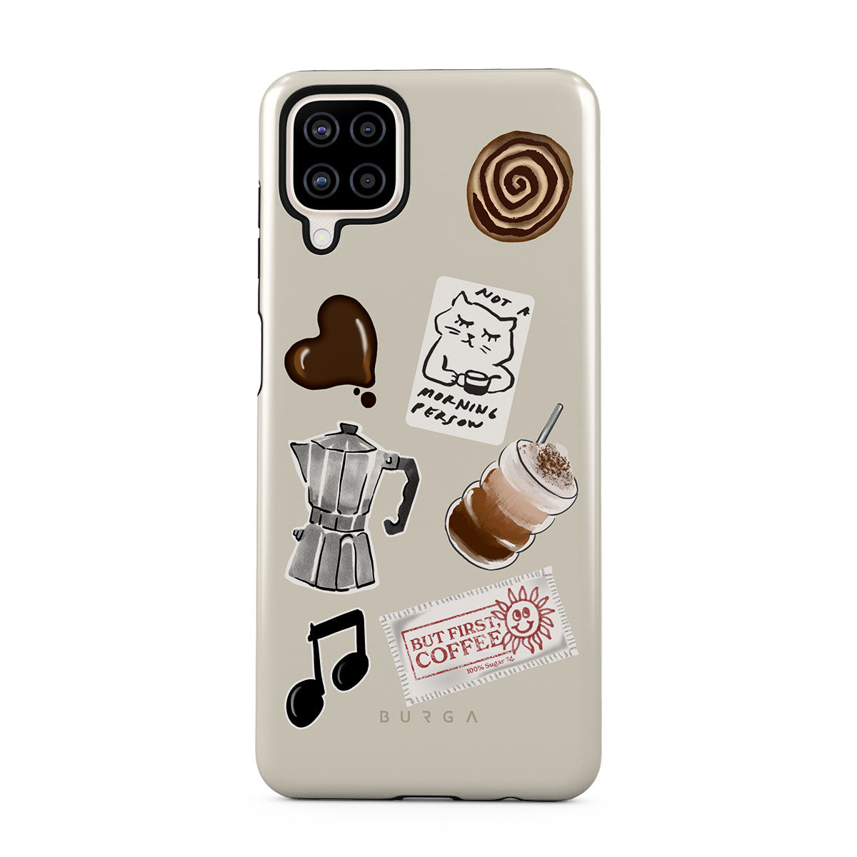 Główne elementy projektu: kawiarkę moka, frappé, cynamonową bułeczkę, czekoladowe serce, naklejkę „Not a morning person”, paragon „But First, Coffee”, nutkę muzyczną.