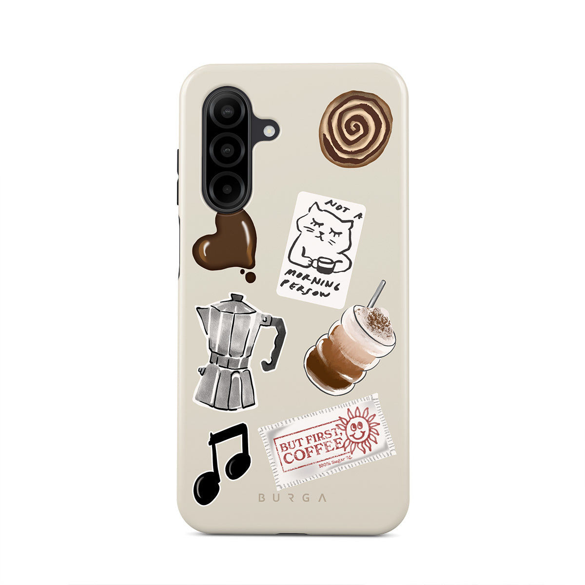 Główne elementy projektu: kawiarkę moka, frappé, cynamonową bułeczkę, czekoladowe serce, naklejkę „Not a morning person”, paragon „But First, Coffee”, nutkę muzyczną.
