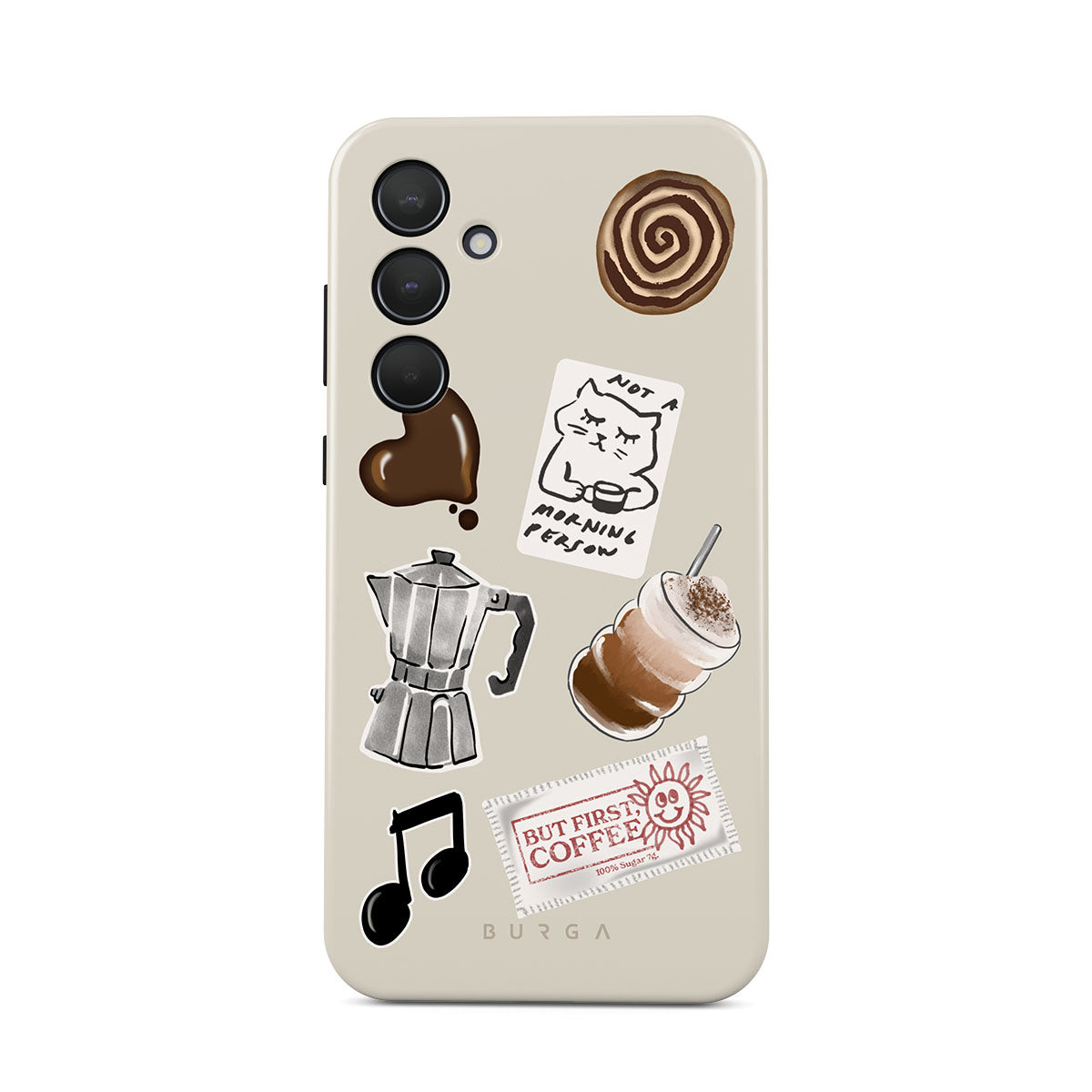 Główne elementy projektu: kawiarkę moka, frappé, cynamonową bułeczkę, czekoladowe serce, naklejkę „Not a morning person”, paragon „But First, Coffee”, nutkę muzyczną.